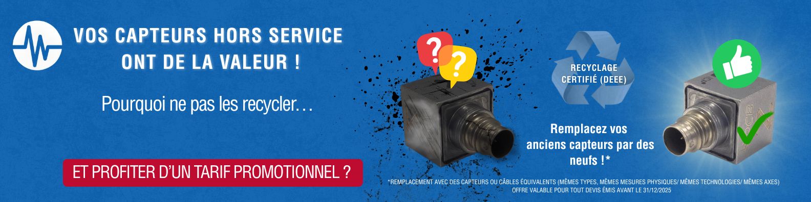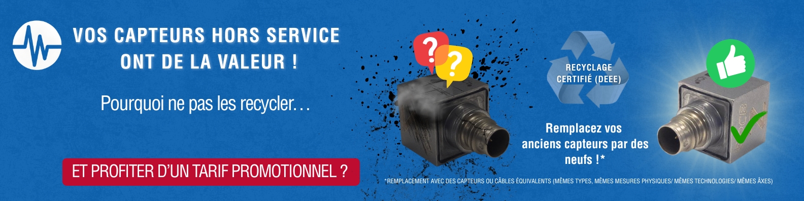 Nous accordons une réduction sur l’achat de nouveaux câbles ou capteurs*. Pour en savoir plus, connectez-vous à votre portail client ou envoyez-nous un message.